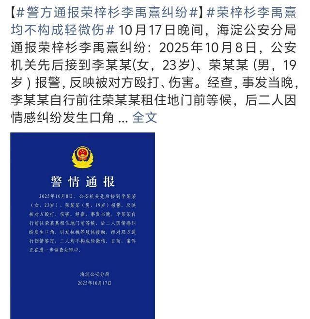 晚上,警方发布通告,称李禹熹与荣梓杉二人是情感纠纷问题,当天晚上李禹熹自行前往荣梓杉租住地门前等候,但后来二人因情感纠纷发生口角,引发拉拽等肢体接触,经对双方进行伤情鉴定,二人均不构成轻微伤。