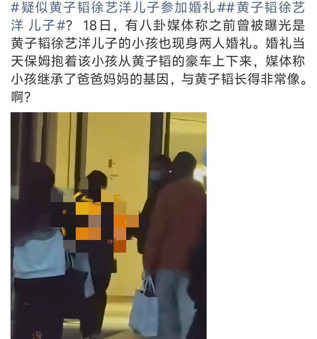 目前为止,可以说是双方各执一词,但是矛盾的起因则是感情问题,而接下来警方将进一步调查,让我们等待下一个结果。 媒体曝疑似黄子韬徐艺洋儿子的小孩现身婚礼现场,长相与黄子韬神似 前面两个瓜足够劲爆,下一个是关于黄子韬徐艺洋的。